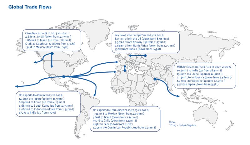 Największym eksporterem LPG na świecie są Stany Zjednoczone – eksport gazu płynnego z tego kraju wzrósł w 2023 r. do ok. 63,5 mln ton z 53,3 mln ton w roku poprzednim. Japonia, Chiny i Unia Europejska są najważniejszymi odbiorcami amerykańskiego surowca. Wszystkie państwa Zatoki Perskiej, czyli drugi największy region produkcji gazu płynnego, eksportuje ok. 44 mln ton – przede wszystkim do Chin i do Indii. Największymi bliskowschodnimi eksporterami są Katar, ZEA, Iran, Arabia Saudyjska i Kuwejt.