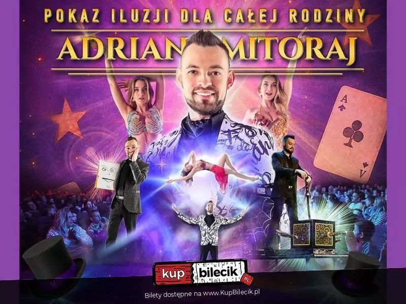 bilety: Magic Mitoraj, czyli Adrian Mitoraj to jeden z najlepszych iluzjonistów. Twórca spektakli iluzji dla największych parków rozrywki w Polsce. Wielokrotnie występował w Niemczech i Szwajcarii. Tym razem pojawi się w Twoim mieście! - taniec jedwabnej chusty Salwy śmiechu, emocje, duże iluzje. Opad szczęki gwarantowany! Pokaz zarówno dla dzieci i dorosłych. Wiek od 5 lat do 10000000000 lat. Bilety do nabycia na: KupBilecik.plIluzjonista Adrian Mitoraj artyści: Adrian Mitoraj, Paul StępieńMagic Mitoraj, czyli Adrian Mitoraj to jeden z najlepszych iluzjonistów. Twórca spektakli iluzji dla największych parków rozrywki w Polsce. Wielokrotnie występował w Niemczech i Szwajcarii. Tym razem pojawi się w Twoim mieście! Podczas rodzinnego przedstawienia zobaczysz ponad 70 minut spektakularnych efektów z pogranicza dziecięcych marzeń. To show, które łączy pokolenia. Doskonała muzyka, gra aktorska. Wszystko po to, aby wprowadzić widzów w inny wymiar dostarczanej rozrywki. Interaktywne widowisko podczas, którego wszyscy czarują razem z prestidigitatorem. Bilety do nabycia na: KupBilecik.pl |